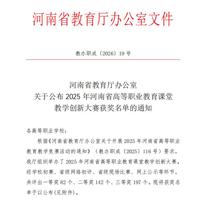 近日,河南省教育厅下发《关于公布2025年河南省高等职业教育课堂教学创新大赛获奖名单的通知》(教办职成〔2026〕19号),beat365教师王冬雅荣获公共基础课程组三等奖,充分彰显了学校强化教学改革、深化内涵建设的显著成效。