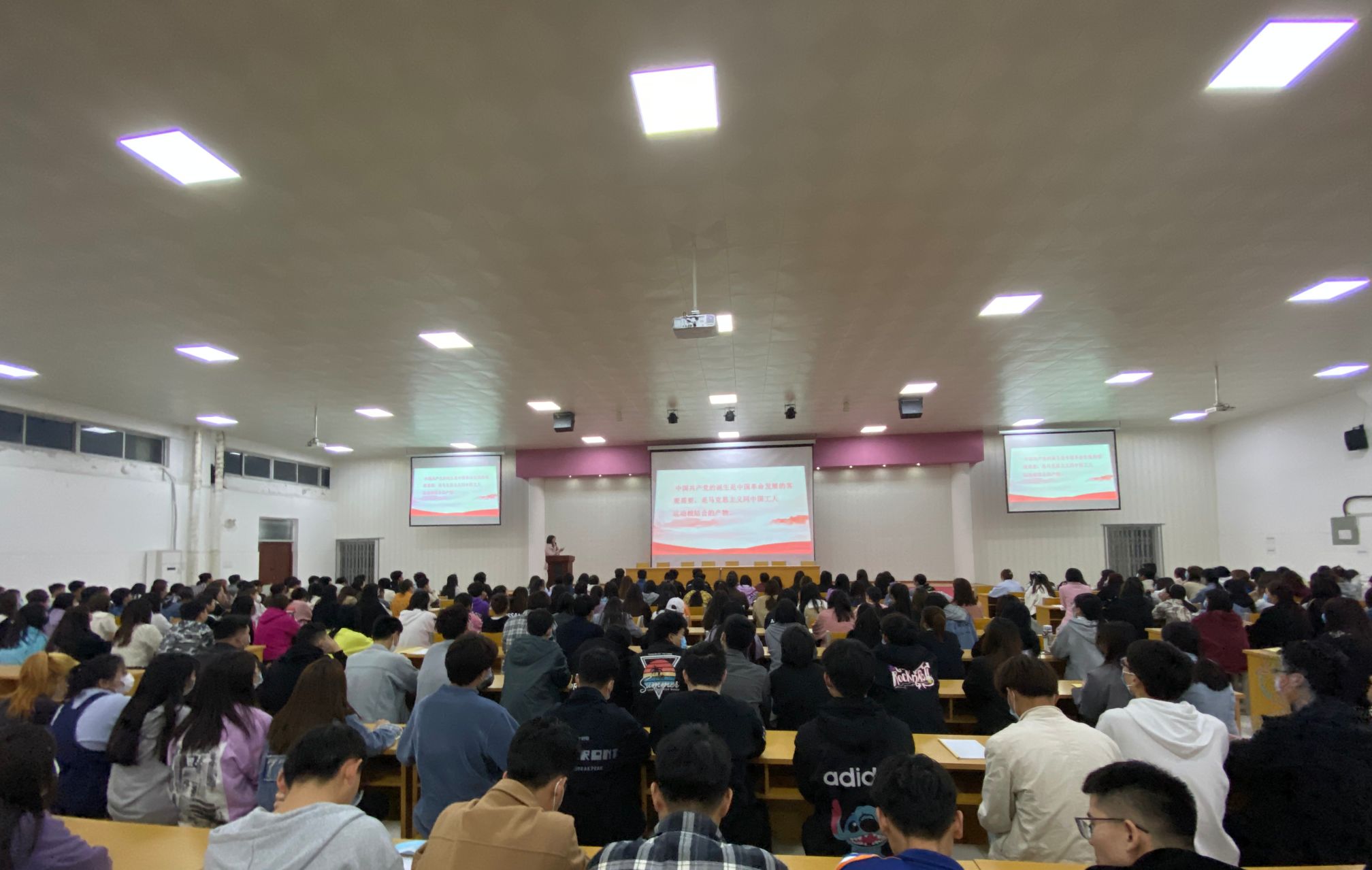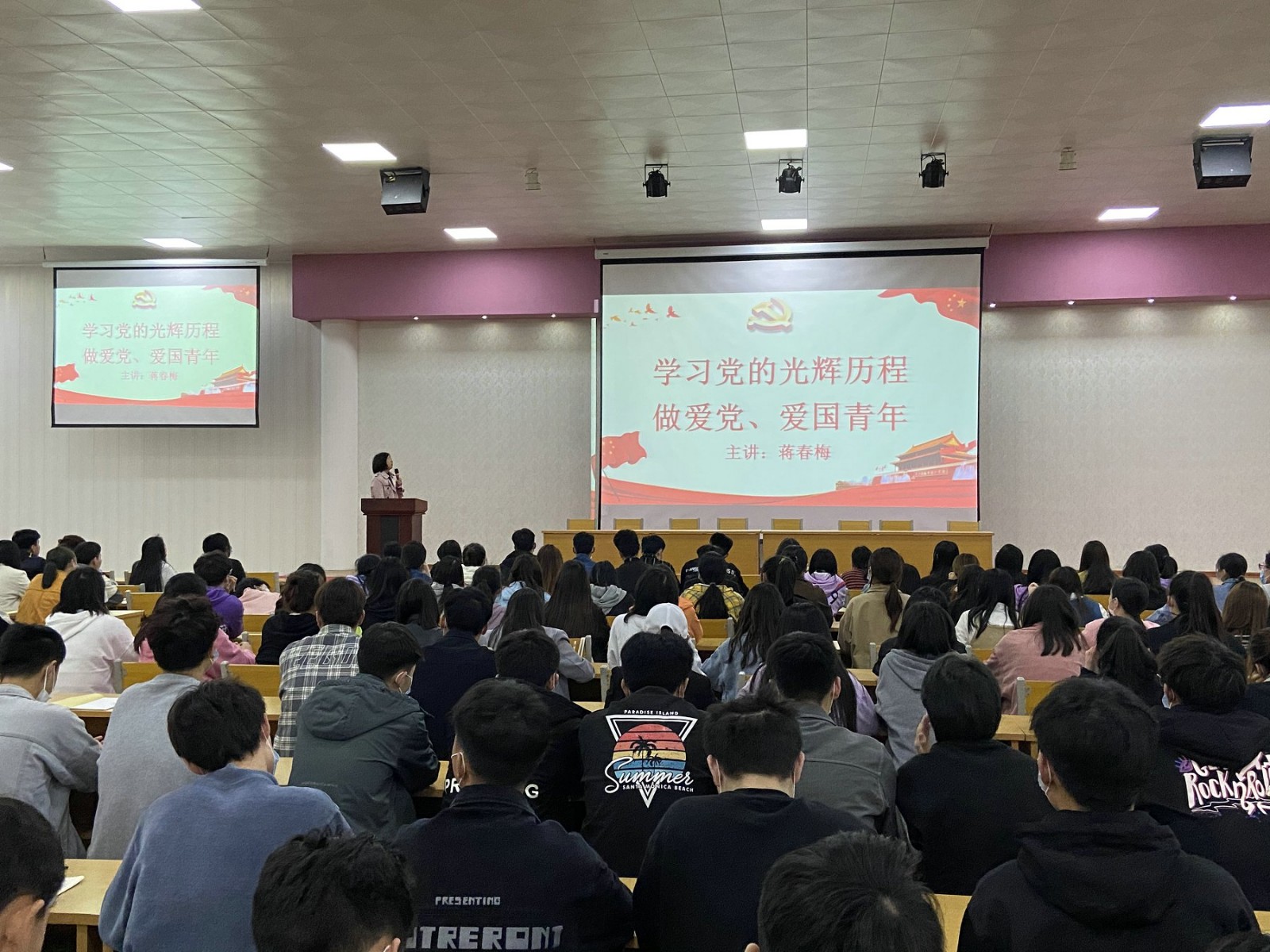 蒋书记通过对中共一大到中共十九大的革命事迹的讲解,用“红船精神”、邓小平语录等具体内容向同学们生动展现了革命前辈开辟新路时“敢为人先”的气魄和胆识,勇往直前、百折不挠的勇气和毅力。正是有了伟大的中国共产党,才有了如今的和平时代,快速发展的经济时代。党领导人民在过去的100年里写下了光辉篇章,也一定能够在新时代继续谱写出更加壮丽的篇章,将继续推进社会主义现代化建设,完成祖国统一大业,维护世界和平与促进共同发展。
