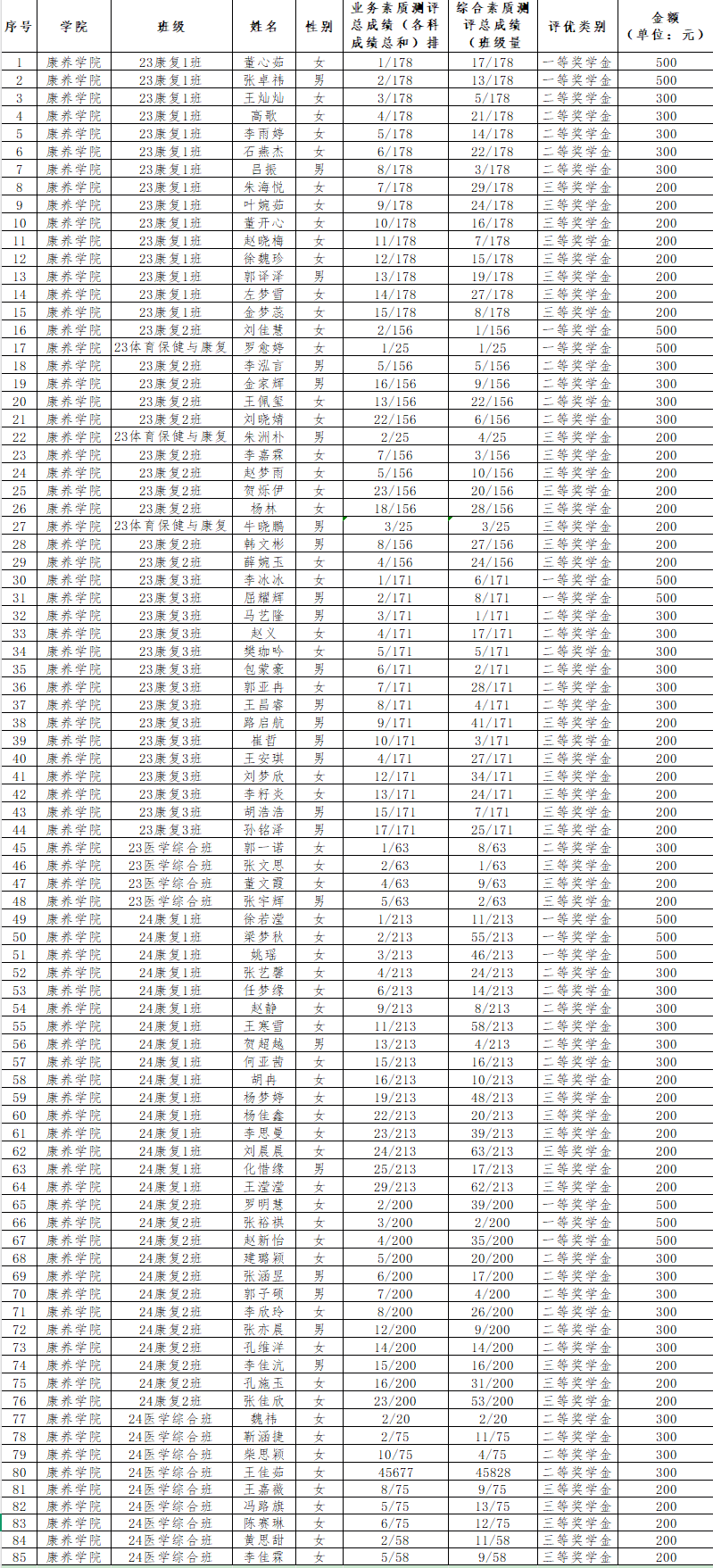 康养学院2024-2025学年校级奖学金拟获得者名单公示