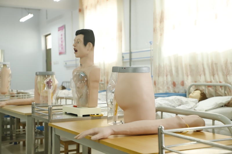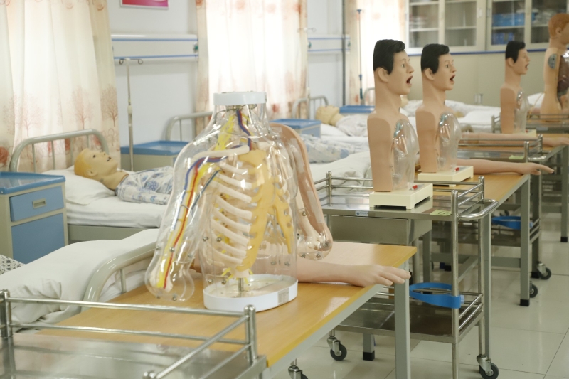 基础护理实训室,主要供护理、助产专业学生实训为主,可容纳40人左右,可以充分满足50余项护理操作练习。房间模拟医院布局,设置床旁呼叫系统、中心供氧装置,多个床单位,并配备多功能模型人和开放式教学系统,供学生仿真模拟训练。主要开设的项目有铺床法、无菌技术、口腔护理、鼻饲法、灌肠法,导尿术,以及各种注射类和静脉输液学习。