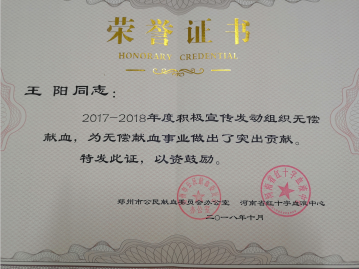 我院团委书记王阳组织学生献血获得荣誉
