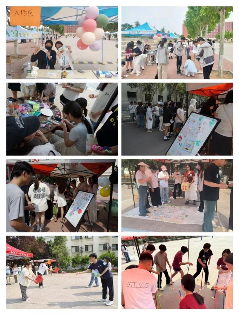 大学生心理健康教育中心在5月14日和5月21日分别于新密校区、郑州校区组织开展了“润心护航”心理游园会活动。游园会有入场区、游戏区、兑奖区、膜法留言区四个互动体验区,游戏区包含快乐小狗集市、幸福7天刮刮乐、校园寻宝、解忧杂货铺、寻人行动、DIY手工漆扇、多彩粘土小工坊、心情大富翁、不倒森林、巧接彩珠等十个摊位,学生可以自由参与,集章打卡换取小礼品。