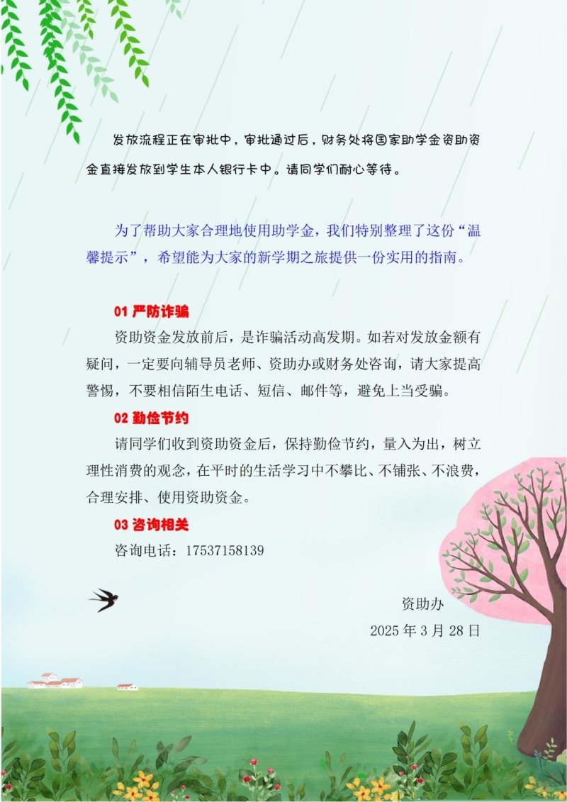 2024-2025学年春季学期3月-5月国家助学金发放进度通报