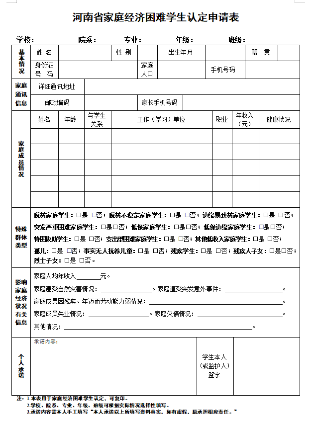 1. 河南省家庭经济困难学生认定申请表