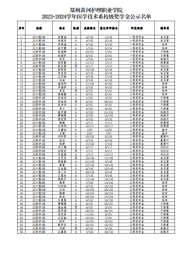 2023-2024学年医学技术系校级奖学金公示名单
