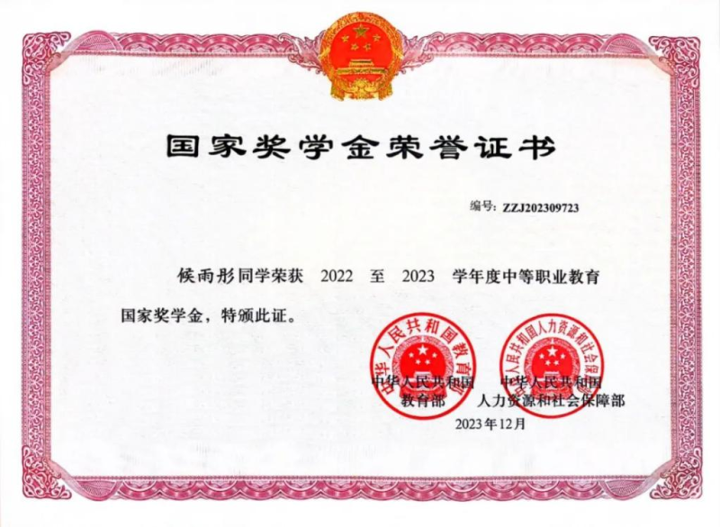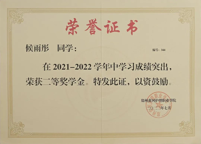 同时,她在丰富自身的情况下也不忽视学习,上课认真听讲,整理学习笔记,认真对待专业课、专业知识、勇于实践,养成良好学习习惯,带动身边的同学们一起学习。在努力坚持下,付出也得到了相对应的回报,第一学年总成绩班内排名第三,并在2021—2022学年被评为校级“三好学生”、2021—2022获得校级二等奖学金。