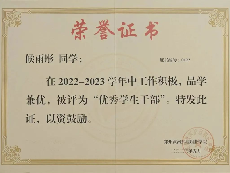在这两年的工作中她较好的完成了班级的共青团工作。功夫不负有心人,因工作突出,在2022—2023年度被评为校级“优秀共青团干部”和“优秀学生干部”。第二学年的成绩仍坚持在班级前三名,也证明了她能够使自身多方面发展的同时兼顾学习。