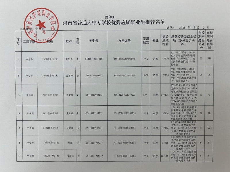 依据学院相关文件要求,中专部各班级依据学习成绩、班级量化、综合表现等参考因素,经过班级评选、辅导员推荐后确定中专部2025届河南省普通大中专学校优秀应届毕业生推荐人选。