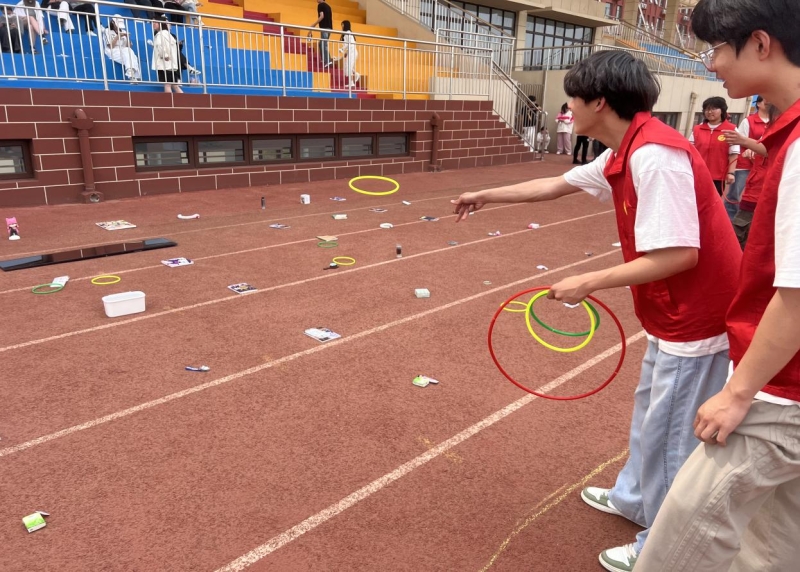 活动当天,五十余名志愿者早早身着红马甲,在操场集合,精心布置四个特色活动区域。在“大声喊出来”区域,24级同学们勇敢地向23级学长学姐们表达感谢、祝福与请教的心声,现场充满了真挚的情感交流;“物物交换”区域,同学们通过抽签形式获得保密数字,凭借数字领取神秘物品,充满未知的惊喜引得同学们热情高涨;“套套乐”区域,同学们手握5个套圈,全神贯注瞄准目标,套中物品时的欢呼声此起彼伏;“跳蚤市场”区域,同学们将精心准备的物品整齐摆放,讨价还价声、欢笑声交织,展现出同学们出色的社交与售卖能力。此次活动打破班级与年级界限,搭建了跨群体交流平台。同学们在交换过程中分享物品背后的故事,传递互助精神,进一步增强了校园文化凝聚力。